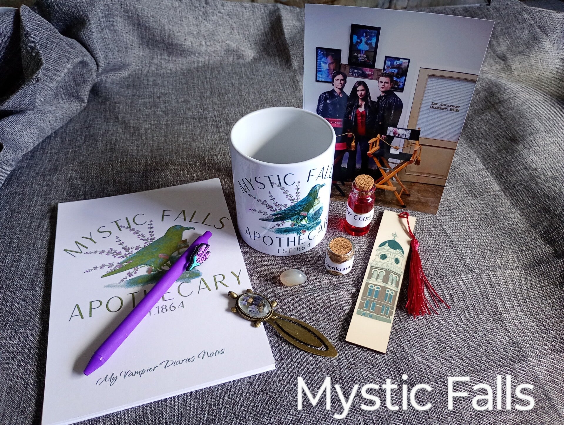 MysticFalls: Enthält 1Tasse, 1Foto,1Block,1Stift,1Lesezeichen,1The Cure ,1Eisenkraut, 1Eisenkraut Lesezeichen, 1Moonstone